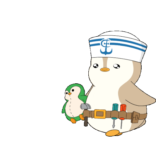 A cute Pudgy Penguin in a sailor hat and tool belt, holding a smaller green penguin, spins around playfully.