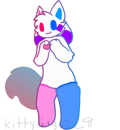 Kitty Dog, a white furry character with pink and blue accents, performs a funny and happy dance.
