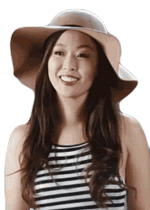 A woman with long hair and a hat laughs heartily, showing a wide, happy smile.