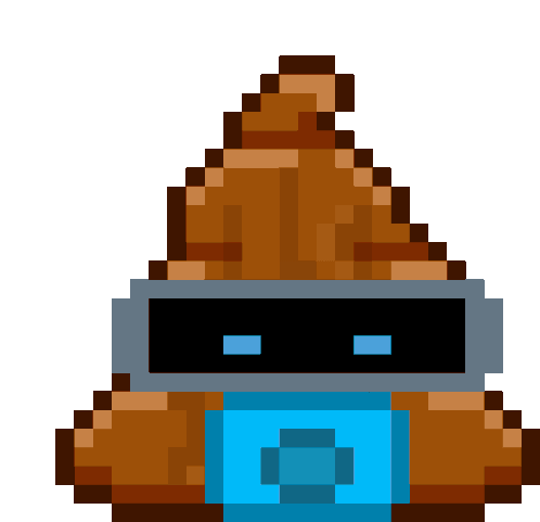 A funny pixel art poop emoji wearing futuristic VR glasses and a blue face mask, perfect for a quirky sticker.