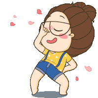An energetic cartoon girl with glasses and suspenders dances happily amidst floating pink flowers and petals.
