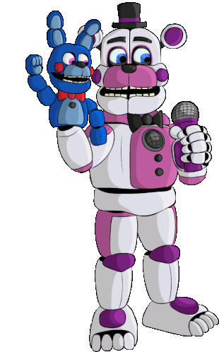 Funtime Freddy, the white and purple animatronic bear, holds his puppet Bon-Bon and a microphone, ready to perform.