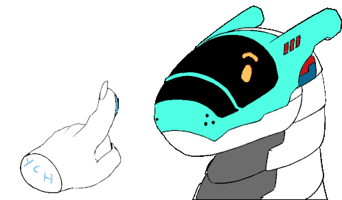 A furry synth character with a cyan head and purple tongue is gently 'booped' on the nose by a hand marked 'YCH'.