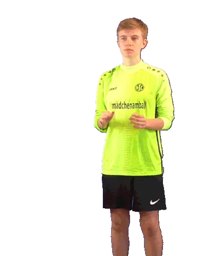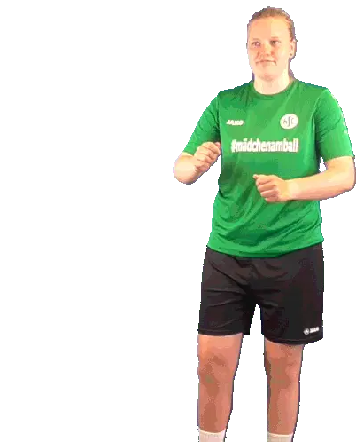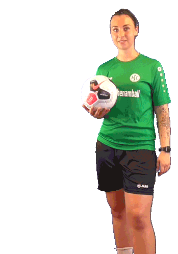 A smiling HSC Hannover Frauen player in a green jersey and black shorts, holding a soccer ball and making a 'call me' gesture.