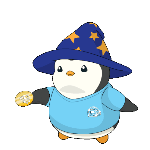 A cute wizard penguin in a blue shirt and star-studded hat tosses a golden coin, making a decision or playing a game of chance.