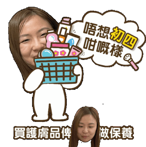 A woman's face on a cartoon body holds a basket of skincare products, expressing a desire to look good after Chinese New Year.