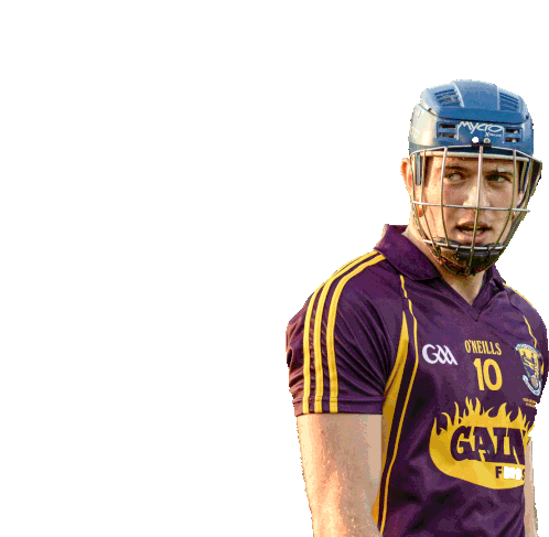 A GAA hurling player in a purple jersey and helmet gets pixelated sunglasses in a 'deal with it' meme style.