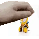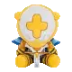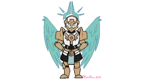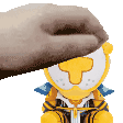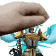 Gabriel Ultrakill gently pets a stuffed lion with a sword on its head, showing a moment of unexpected tenderness.