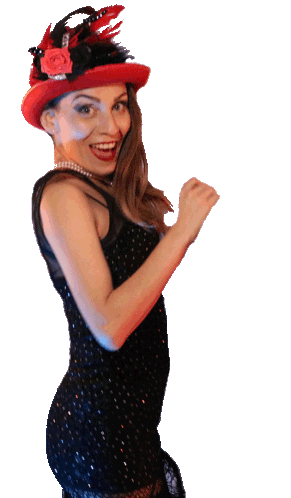 Gaby La Scene, a vibrant character, smiles while wearing a distinctive red hat adorned with elegant feathers.