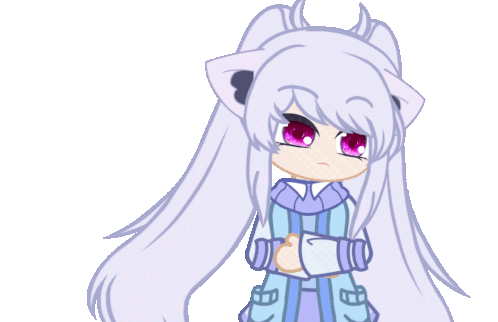 A cute Gacha character with long white hair and pink eyes blushes shyly, expressing embarrassment or cuteness.