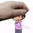 A pixel art Gacha Club character is gently held by a giant hand, perfect for expressing care or affection.