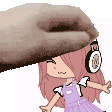 A Gacha-style cartoon girl with pink hair and headphones gets playfully pummeled on the head by a small white dog.