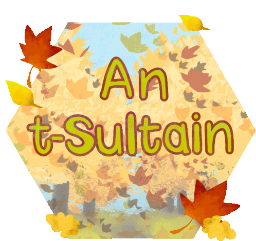 Animated sticker featuring 'An t-Sultain' (September) in Scottish Gaelic, surrounded by autumn leaves.