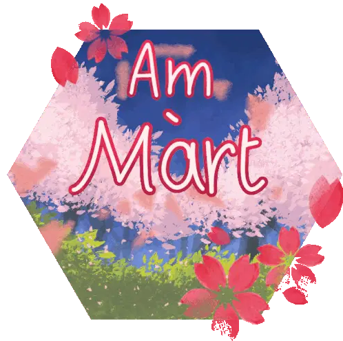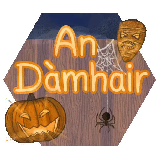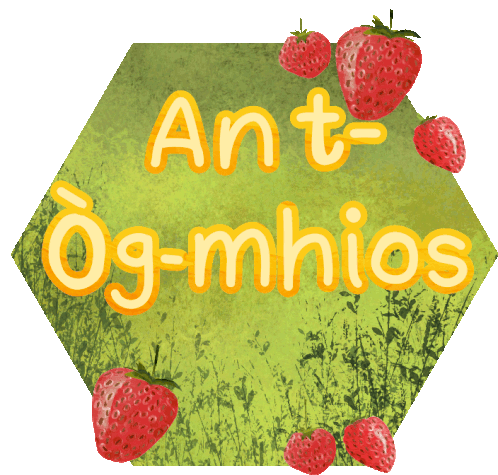 A vibrant hexagonal sticker featuring 'An t-Òg-mhios' (June) in Scottish Gaelic, adorned with fresh strawberries.
