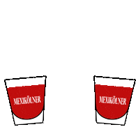 Two glasses of fiery red Mexikölner clink together, with vibrant flames burning behind them, celebrating the spicy drink.