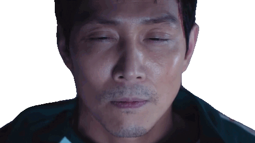 Seong Gi-hun from Squid Game slowly opens his eyes, gaining consciousness with a determined expression.