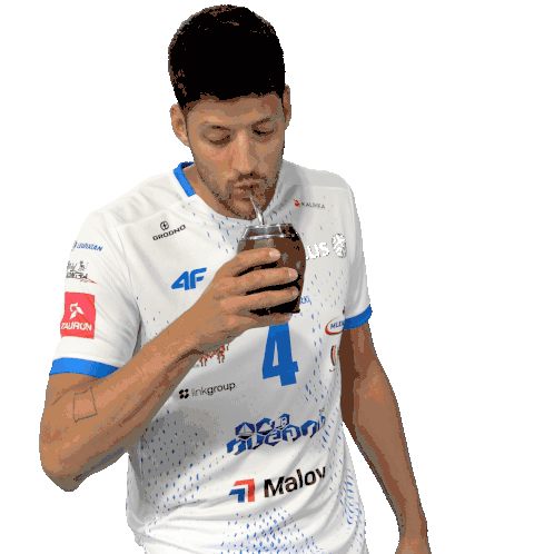 Joaquin Gallego, the volleyball middle blocker, smiles and gives a thumbs-up while holding his yerba mate.