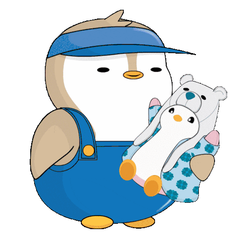 Animated Pudgy Penguin character with a collection of cute plush toys, including bears and other penguins, in a playful room setting.