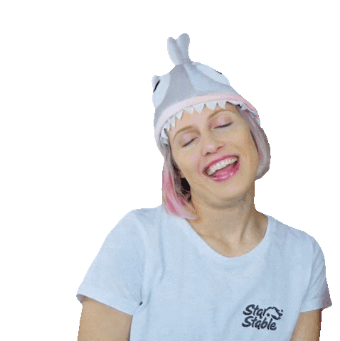Game Master Ylva, with pink hair, smiles brightly while wearing a fun grey shark hat, looking up and to the side.