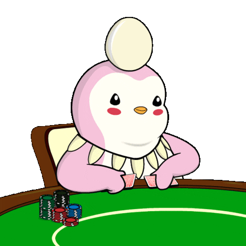 A cute cartoon penguin with an egg on its head sits at a poker table, holding cards and surrounded by chips, ready to play.