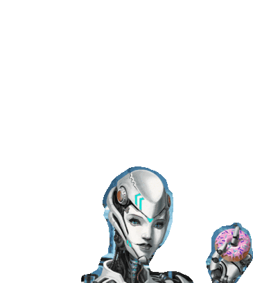A futuristic Gameforge robot character holds a pink donut with sprinkles, perfect for gaming and sci-fi enthusiasts.