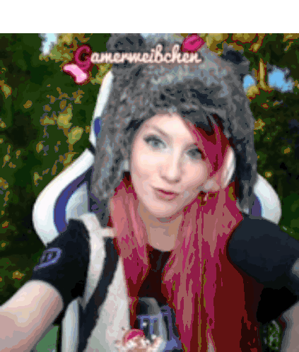 Gamerweibchen, the Twitch streamer, playfully points a toy gun then enjoys a sweet chocolate treat.