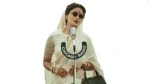 Alia Bhatt as Gangubai Kathiawadi, dressed in a white saree and sunglasses, speaks into a vintage 'Chicago Radio' microphone.