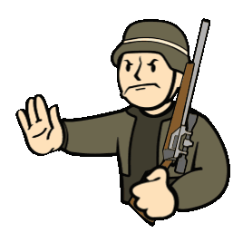 A cartoon soldier in a helmet holds a rifle and makes a clear stop gesture with his hand.