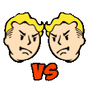 Two angry cartoon male heads, resembling Vault Boy, face each other with a red 'VS' text below, depicting a confrontation.