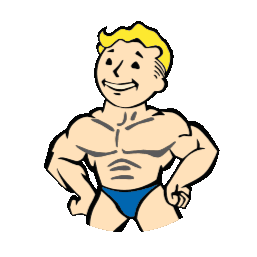 Fallout's iconic Vault Boy character flexing his muscular arms, posing shirtless in blue briefs with a confident smile.