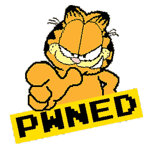 Garfield pixel art sticker showing the iconic cat pointing with the word 'PWNED' displayed below.