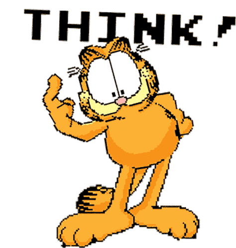 Garfield the cat scratches his head in thought as the word 'THINK!' appears above him in this animated sticker.