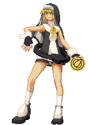 Animated pixel art sticker of Bridget from Guilty Gear, featuring her iconic nun-like outfit and a Garlicoin symbol.