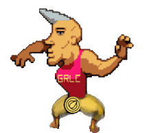 A pixel art Chad character, sporting a 'GRLC' shirt and Garlicoin belt, performs an energetic dance.