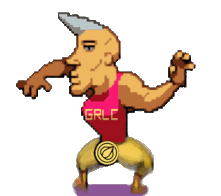 Pixel art Chad character with 'GRLC' shirt performs a funny dance, representing Garlicoin and its meme culture.