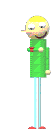 Animated pixel art sticker of Garrett from Fnf, a character with a yellow head, long nose, and green body, standing still.