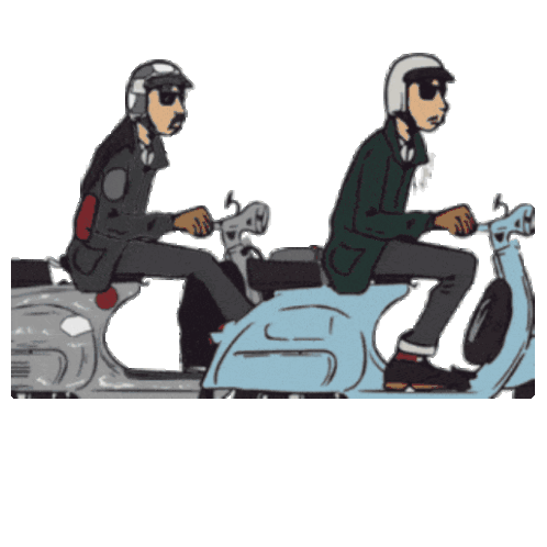 Two cartoon men on scooters with helmets and sunglasses, riding with the caption 'ON THE WAY BOSS'.