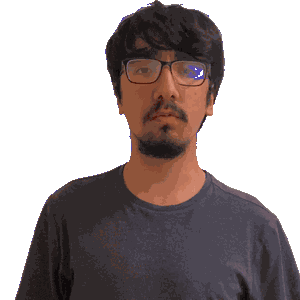 a man wearing glasses and a black shirt is covering his mouth with his hands
