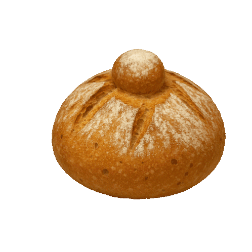 A traditional Galician bolo de pan, a round loaf of bread with a distinctive small ball on top, dusted with flour.
