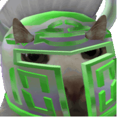 A spinning cat, Gato, wearing a distinctive emerald and purple helmet, creating a fun animated sticker.