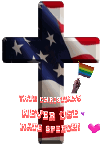 Animated sticker featuring an American flag cross and a rainbow flag, promoting gay rights and anti-hate speech for Christians.