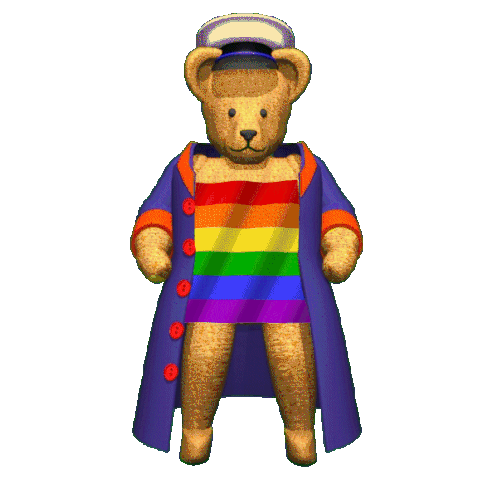 A cute 3D animated teddy bear proudly reveals a vibrant rainbow-striped shirt under its purple coat, celebrating gay pride.