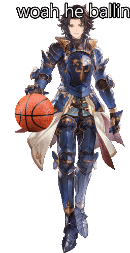 Lancelot from Granblue Fantasy in blue armor, standing with a basketball, captioned 'woah he ballin''.