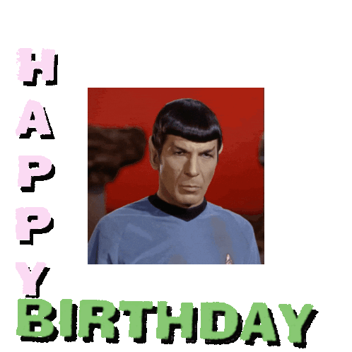 Spock from Star Trek wishes a Happy Birthday with his iconic Vulcan salute, surrounded by colorful 'Happy Birthday' text.