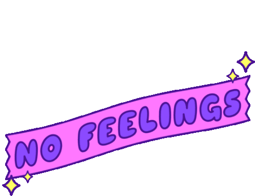 Animated pink ribbon sticker with purple 'NO FEELINGS' text and twinkling yellow sparkles, expressing indifference.