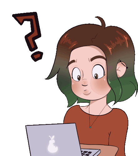 Animated sticker of a geek girl with green hair looking confused at her laptop, a question mark appearing above her head.