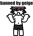 An animated pixel art sticker featuring a character evolving, with the text 'banned by geige' prominently displayed above.