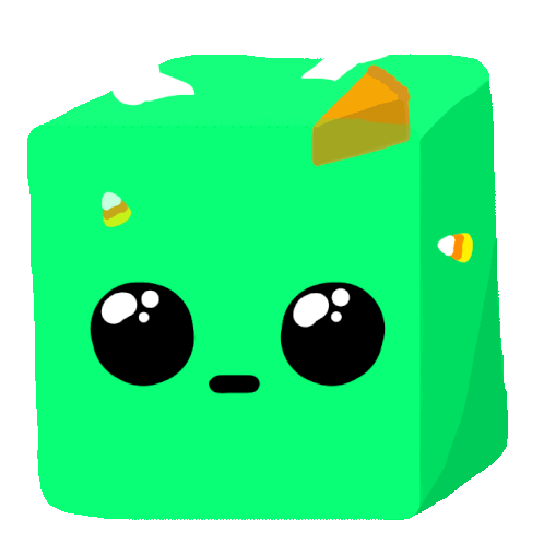 A cute green gelatinous cube with big eyes, adorned with pumpkin pie and candy corn, perfect for Halloween.