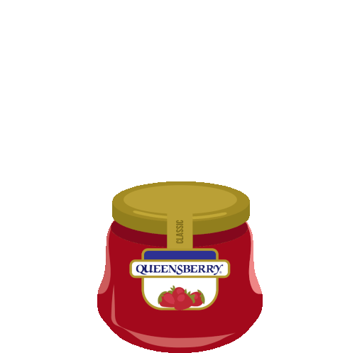 An animated Queensberry jam jar with its lid open, as fresh red strawberries fall into the delicious jam.
