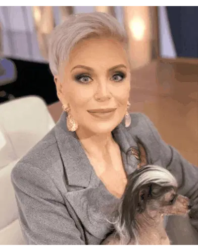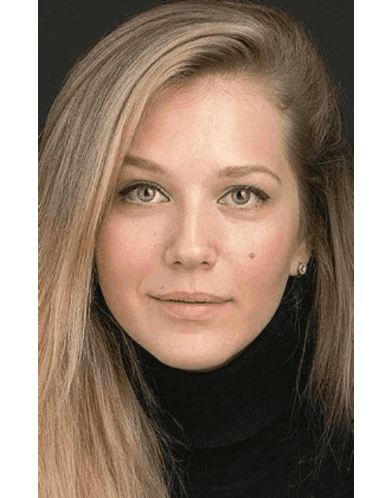 a woman with long blonde hair wearing a black turtleneck looks at the camera